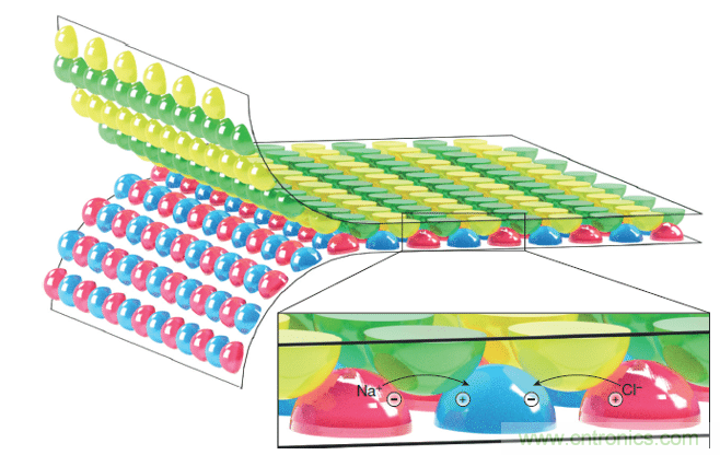 紅色凝膠含有鹽水,而藍(lán)色凝膠含有淡水。離子原本會從紅色凝膠流向藍(lán)色凝膠,但由于基板的間隔,無法出現(xiàn)這樣的流動。與此同時(shí),與這塊基板對應(yīng)的另一塊基板上布置了綠色和黃色凝膠,當(dāng)它們橋接在藍(lán)色和紅色凝膠之間的空隙時(shí),就能為離子運(yùn)動提供通道。