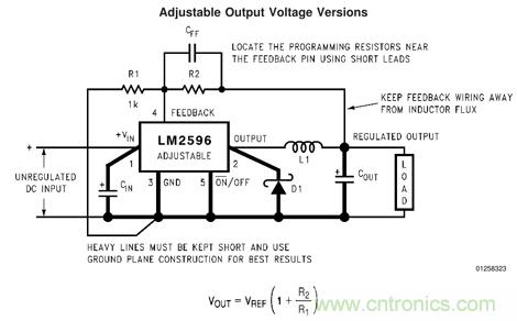 【導(dǎo)讀】DC-DC開關(guān)穩(wěn)壓電路由于其高效率、大電流的優(yōu)點(diǎn)被廣泛使用??烧{(diào)DC-DC可以通過(guò)調(diào)節(jié)反饋分壓電阻來(lái)調(diào)節(jié)輸出電壓。圖1是常用DC-DC降壓穩(wěn)壓芯片LM2596-Adj的典型應(yīng)用電路,通過(guò)調(diào)節(jié)R1和R2就可以得到所需輸出電壓。
