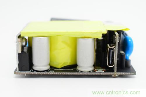 二次側低壓輸出濾波為兩枚固態(tài)電容,Type-C輸出母座安裝在一塊獨立PCB小板上。
