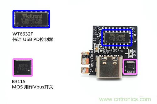 14腳IC為 Weltrend偉詮WT6632F ,來自偉詮的 USB PD控制器,同時支持QC2.0和QC3.0協(xié)議。粉色框內是絲印為 B3115 的貼片MOSFET,用于Vbus開關。