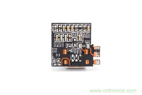 由于沒有使用SR技術,PCB背面元器件較少,主要是位于左上的 LD5760E,來自通嘉科技的PWM控制器,與前述的東芝TK10A60W組成一次側電路。左下方的白色器件為CT1019光耦,用于電壓反饋。