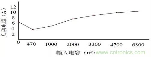 從理論上講,增大電路中的濾波電容 C容量的確可以使輸出電壓的波形變得更為平滑、起伏更小,但在電路接通瞬間,電路中所產(chǎn)生的沖擊電流因素卻不能被忽略;在一些濾波電路的維修中對(duì)濾波電容的替換也存在沖擊電流的問題,在不更換其他元件的前提下,單純提高濾波電容的容量會(huì)使整個(gè)電路的實(shí)際使用壽命大大縮短,甚至燒毀整個(gè)電路。況且,單純地提高濾波電容的容量對(duì)改善輸出電壓的作用也是有限的。做一個(gè)簡(jiǎn)單實(shí)驗(yàn)外接不同輸入電容的大小啟動(dòng)時(shí)的電流曲線,如下圖所示為輸入外接電容大小與啟動(dòng)電流的關(guān)系曲線。