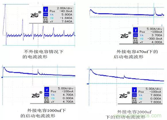 上圖為外接電容大小不同的啟動(dòng)電流波形。外接電容在一定情況下,啟動(dòng)電流達(dá)到最低值,對(duì)整個(gè)電路的輸入,輸出環(huán)境有很大的改善。當(dāng)外接電容超過這個(gè)范圍就會(huì)導(dǎo)致啟動(dòng)電流增大,對(duì)其他器件的威脅也就隨之增大,導(dǎo)致出現(xiàn)不同程度的器件損壞。