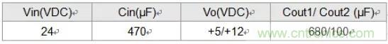 為了進(jìn)一步穩(wěn)定輸入電源,在輸入端增加一電容Cin,若為了進(jìn)一步減小輸出紋波和噪聲,可在輸出端增加一串聯(lián)等效阻抗小的電容Cout,但容值不能超過該產(chǎn)品的最大容性負(fù)載,否則會(huì)造成電源模塊啟動(dòng)不良。推薦外接電容值,如表1所示。