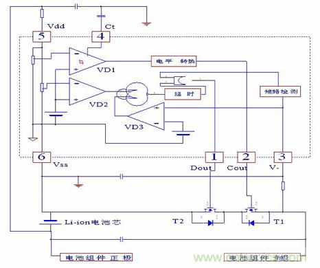 當電池電壓因放電而降低至設(shè)定值VD(2.3-2.5V)時, VD2翻轉(zhuǎn),以IC內(nèi)部固定的短時間延時后,使Dout變?yōu)榈碗娖?,T2截止,放電停止。