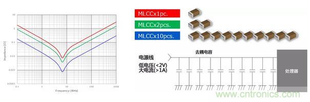 為了抑制電壓波動,會使用多個去耦用MLCC