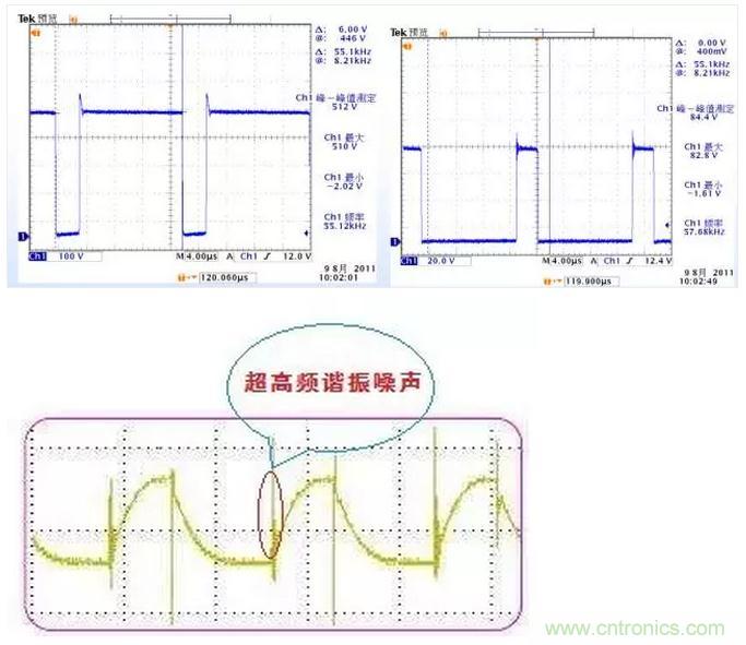 通過(guò)選用軟恢復(fù)特性二極管、結(jié)電容小的開(kāi)關(guān)管和減少布線長(zhǎng)度等措施可以減少超高頻諧振噪聲。