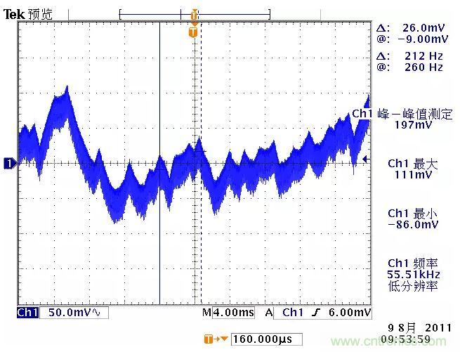 低頻紋波是與輸出電路的濾波電容容量相關(guān)。由于開(kāi)關(guān)電源體積的限制,電解電容的容量不可能無(wú)限制地增加,導(dǎo)致輸出低頻紋波的殘留,該輸出紋波頻率隨整流電路方式的不同而不同。