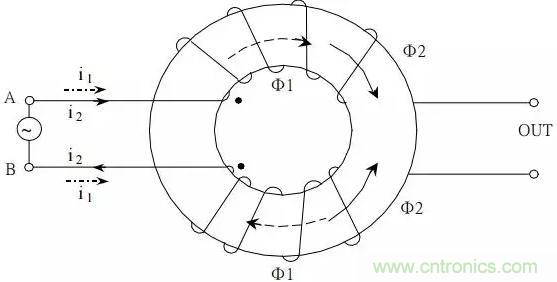 如圖所示,在同一磁環(huán)上繞上兩組方向相反的線圈,據(jù)右手螺旋管定則可知,當(dāng)在輸入端A、B兩端加上極性相反,信號幅值相同的差模電壓時,有實線所示的電流i2,在磁芯中產(chǎn)生實線所示的磁通Φ2,只要保證兩繞組完全對稱,則磁芯中兩不同方向之磁通相互抵消??偞磐榱悖€圈電感幾乎為零,對常模信號無阻抗作用。若在輸入端A、B兩端加上極性相同,幅值相等的共模信號時,有虛線所示的電流i1,在磁芯中產(chǎn)生虛線所示的磁通Φ1,則磁芯中磁通有相同的方向而互相加強(qiáng),使每一線圈的電感值為單獨存在時的兩倍,而XL =ωL,因此,此一繞法的線圈對共模干擾有很強(qiáng)的抑制作用。