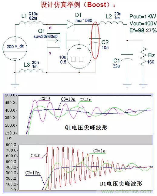 將開關(guān)管Q1、拓?fù)淅m(xù)流二極管D1和一個(gè)無損的拓?fù)潆娙軨2組成一個(gè)在布線上盡可能簡(jiǎn)短的吸收回路。