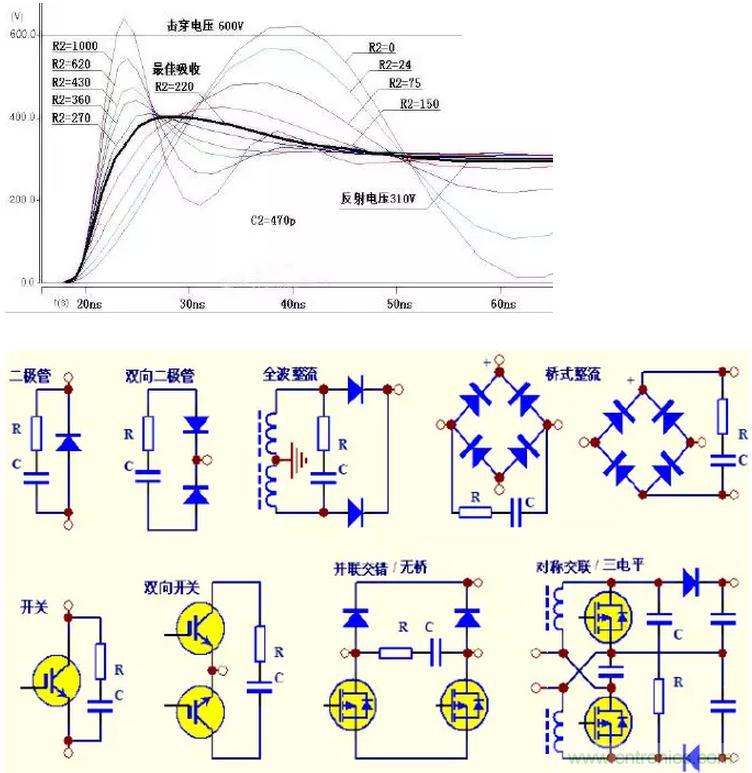對(duì)應(yīng)一個(gè)特定的吸收環(huán)境和一個(gè)特定大小的電容C,有一個(gè)最合適大小的電阻R,形成最大的阻尼、獲得最低的電壓尖峰。