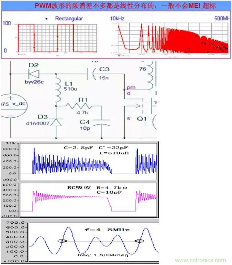 引起電流尖峰第二種情況是對(duì)電容的充放電電流。這些電容可能是:電路分布電容、變壓器繞組等效分布電容、設(shè)計(jì)不恰當(dāng)?shù)奈针娙?、設(shè)計(jì)不恰當(dāng)?shù)闹C振電容、器件的等效模型中的電容成分等等。
