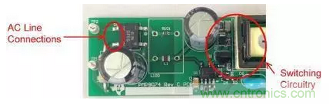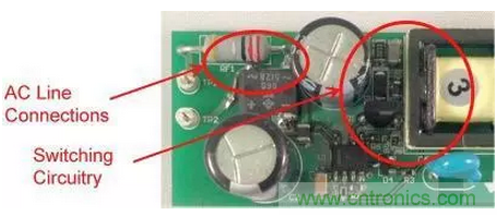 圖1是這些非計劃中電容的一個實例。圖中的右側(cè)是一個垂直安裝的FET,所帶的開關節(jié)點與鉗位電路延伸至了圖片的頂部。輸入連接從左側(cè)進入,到達距漏極連接1cm以內(nèi)的位置。這就是故障點,在這里FET的開關電壓波形可以繞過EMI濾波器耦合至輸入。