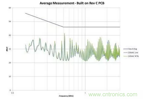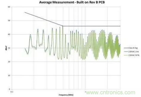 圖4是修改后的效果圖。我們在故障點位置為EMI規(guī)范獲得了大約6dB的裕量。此外,我們還顯著減少了總體EMI簽名。所有這些改善都僅僅是因為布局的調(diào)整,并未改變電路。如果您的電路具有高電壓開關并使用了屏蔽距離,您需要非常小心地對其進行控制。