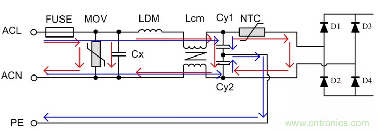 對ACL與ACN之間施加的浪涌電壓稱為差模浪涌電壓,差模路徑如圖中紅線所示;對ACL(或ACN)與PE之間施加的電壓稱為共模浪涌電壓,共模路徑如圖中藍線所示。