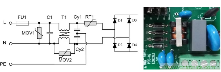 背景:以某型號的電源模塊為例,該模塊是ZLG致遠電子為某客戶定制的電源模塊,輸入85VAC~350VAC,且EMC前級電路電路嵌入到模塊中??估擞恳蟛钅k妷?KV,共模電壓6KV。更換更大的保險絲后可承受6KV差模電壓。其前級原理圖及對應實物圖如圖2所示。