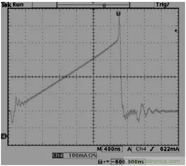 32.反激拓補(bǔ)結(jié)構(gòu),變壓器B值需小于3500高斯,如果變壓器飽和一切動(dòng)作將會(huì)失控,如下,上圖為正常,下圖為飽和。