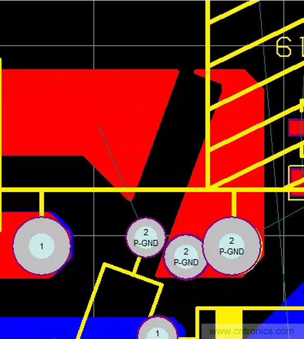 47.PCB的熱點(diǎn)區(qū)域一定要遠(yuǎn)離輸入、輸出端子,防止噪聲源串到線上導(dǎo)致EMI變差,在不得已而為之時(shí),可增加地線或其它屏蔽方式進(jìn)行隔離,如下圖增加了一條地線進(jìn)行有效隔離。