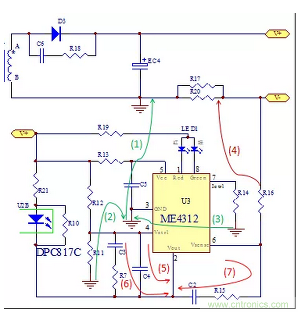 如(1)(2)(3)綠線所示,R11的地和R14的地連接到芯片的地,再連接到EC4電解電容的地。注意不可連到變壓器的地,因?yàn)樽儔浩鞔渭?jí)A->D3->EC4->次級(jí)B形成功率環(huán),如果ME4312芯片的地接到次級(jí)B線到EC4電容之間,受到較強(qiáng)的di/dt干擾會(huì)導(dǎo)致系統(tǒng)的不穩(wěn)定等因素。