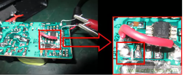 通過(guò)斷開(kāi)PCB銅箔使用一根導(dǎo)線連到輸出電容地,隔開(kāi)ME4312B芯片地,如下圖: