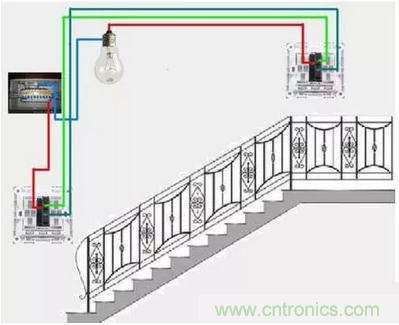 有的朋友說中間可不可以用雙聯(lián)雙控開關,也是可以的。不過雙聯(lián)開關上有兩個開關,需用同時按下。