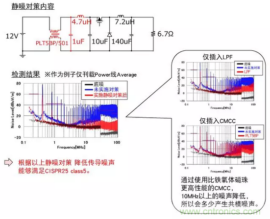 【導(dǎo)讀】汽車中搭載各種各樣的電子設(shè)備。為了產(chǎn)生電子設(shè)備具備各自需要的電壓,而致力于電源電路的研發(fā)。為使電源電路具有效率化,使用開關(guān)方式的產(chǎn)品,但這也是產(chǎn)生噪聲的問題根源。在此,介紹車載設(shè)備電源電路(DC-DC轉(zhuǎn)換器)的靜噪對(duì)策。在此介紹的對(duì)策內(nèi)容和對(duì)策元件不僅適用于汽車還適用于工業(yè)用設(shè)備等。