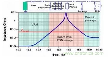 在調(diào)試該故障前先回顧下電源噪聲抑制的原理。如下圖所示,電源分配網(wǎng)絡(luò)中不同的頻段由不同的元件來抑制噪聲,去耦元件包含電源調(diào)整模塊(VRM)、去耦 電容、PCB電源地平面對、器件封裝和芯片。VRM包含電源芯片及外圍的輸出電容,大約作用于DC到低頻段(100K左右),其等效模型是一個(gè)電阻和一個(gè) 電感組成的二元件模型。去耦電容最好使用多個(gè)數(shù)量級容值的電容配合使用,充分覆蓋中頻段(數(shù)10K到100M左右)。由于布線電感和封裝電感的存在,即時(shí) 大量堆砌去耦電容也難以在更高頻起到作用。PCB電源地平面對形成了一個(gè)平板電容,也具有去耦作用,大約作用在數(shù)十兆。芯片封裝和芯片負(fù)責(zé)高頻段 (100M以上),目前的高端器件一般會在封裝上增加去耦電容,此時(shí)PCB上的去耦范圍可以降低到數(shù)十兆甚至幾兆。因此,在電流負(fù)載不變的情況下,我們只 要判斷出電壓噪聲出現(xiàn)在哪個(gè)頻段,那么針對這個(gè)頻段所對應(yīng)的去耦元件進(jìn)行優(yōu)化即可。在兩個(gè)去耦元件的相鄰頻段時(shí)兩個(gè)去耦元件會配合作用,所以在分析去耦元 件臨界點(diǎn)時(shí)相鄰頻段的去耦元件也要同時(shí)納入考慮。