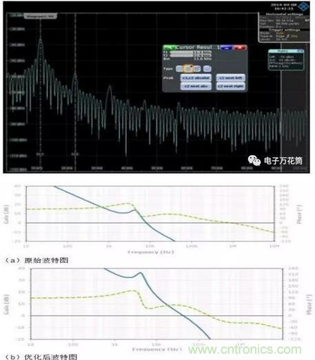 一般來說,11.3KHz應(yīng)該是VRM的管轄范圍,此處出現(xiàn)較大噪聲說明VRM電路設(shè)計(jì)不能滿足 要求。這里對VRM的性能進(jìn)行分析,VRM分析的方法眾多,此處主要采用仿真其反饋環(huán)路波特圖的手段。波特圖主要觀察幾個(gè)關(guān)鍵信息:1、穿越頻率,增益曲 線穿越0dB線的頻率點(diǎn);2、相位裕度,相位曲線在穿越頻率處所對應(yīng)的相位值;3、增益裕度,相位在-360°時(shí)所對應(yīng)的增益值。這里我們主要關(guān)注穿越頻 率和相位裕度這兩個(gè)指標(biāo)。從VRM的環(huán)路波特圖(如下圖a)可以看到,VRM的穿越頻率在8KHz左右,相位裕度37度。這里存在兩個(gè)問題:首先VRM的 相位裕度一般需要大于45度才能保證環(huán)路的穩(wěn)定工作,這里相位裕度稍小一些,需要增加相位裕度;其次穿越頻率太低,穿越頻率附近VRM的調(diào)整作用逐漸降低,而此頻點(diǎn)bulk電容還起不到作用,所以在8KHz附近會存在較高的阻抗,這個(gè)頻點(diǎn)的噪聲抑制作用較差。下圖(b)是優(yōu)化VRM環(huán)路之后的波特圖,調(diào)整相位裕度到50度,穿越頻率推到46KHz左右。