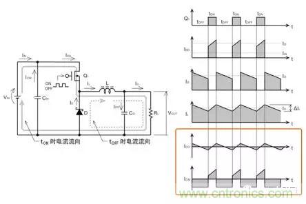 首先,為了理解輸入電容器和輸出電容器的作用,先來(lái)重溫一下降壓型DC/DC轉(zhuǎn)換器的電流的流向。通過(guò)理解流向各種電容器的不同電流性質(zhì),可以清楚明白應(yīng)選擇哪種電容器。