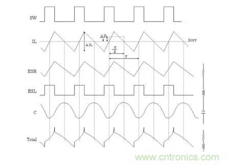 通過(guò)開(kāi)關(guān)所產(chǎn)生的電感電流紋波ΔIL將產(chǎn)生與ESR成單純正比的紋波電壓,有些ESL則會(huì)產(chǎn)生方形波電壓,與電容值部分合成,最下方波形成為最終的輸出紋波電壓波形。