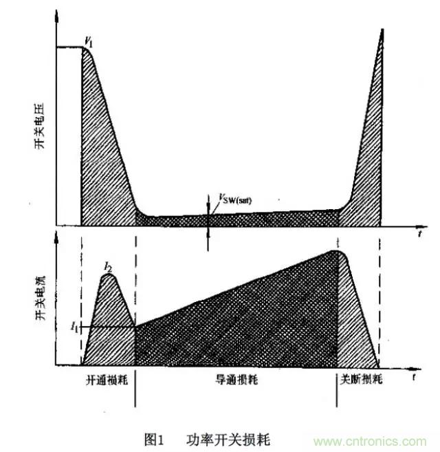 功率開關是典型的開關電源內部最主要的兩個損耗源之一。損耗基本上可分為兩部分:導通損耗和開關損耗。導通損耗是當功率器件已被開通,且驅動和開關波形已經穩(wěn)定以后,功率開關處于導通狀態(tài)時的損耗;開關損耗是出現在功率開關被驅動,進入一個新的工作狀態(tài),驅動和開關波形處于過渡過程時的損耗。這些階段和它們的波形見圖1。
