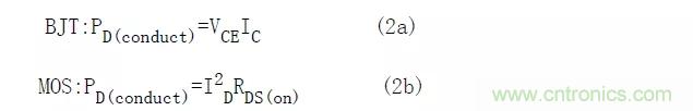 控制這個損耗的典型方法是使功率開關導通期間的電壓降最小。要達到這個目的,設計者必須使開關工作在飽和狀態(tài)。這些條件由式(2a)和式(2b)給出,通過基極或柵極過電流驅動,確保由外部元器件而不是功率開關本身對集電極或漏極電流進行控制。