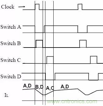當(dāng)輸入電壓比輸出電壓低△V,即輸入電壓略高于輸出電壓時,系統(tǒng)工作于降壓式BuckBoos模式。開關(guān)周期起始時,開關(guān)管B/D先同時導(dǎo)通,然后A/C同時導(dǎo)通,最后是A/D同時導(dǎo)通,即開關(guān)管導(dǎo)通的順序為:B/D–A/C–A/D。