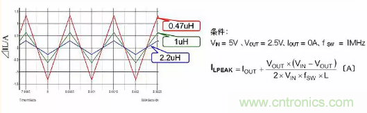 在這里,為加深對(duì)電感工作的理解,進(jìn)一步說(shuō)明電感值變化時(shí)電感電流如何變化的情形。下圖表示在相同工作條件下將電感值設(shè)為0.4μH、1μH、2.2μH時(shí)ILPEAK。