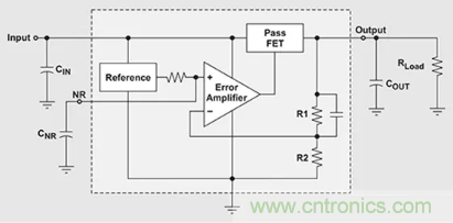 圖1:LDO中的傳輸元件為P型MOSFET,其可以在接近飽和狀態(tài)下工作。這與傳統(tǒng)線性穩(wěn)壓器相比,是通過降低VDROPOUT來提高效率。(圖片來源:Texas Instruments)