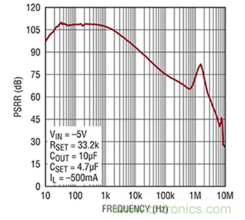 圖2:該圖顯示高性能LDO的PSRR頻率響應:在1kHz時,良好LDO的基準值介于60dB至110dB之間。(圖片來源:Analog Devices)