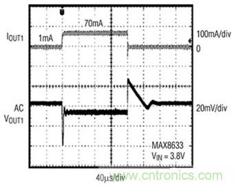 圖3:對輸出負載快速變化的瞬態(tài)電壓響應是無線傳感器應用的LDO關鍵性能指標。此處所示為高性能LDO的響應。(圖片來源:Maxim Integrated)