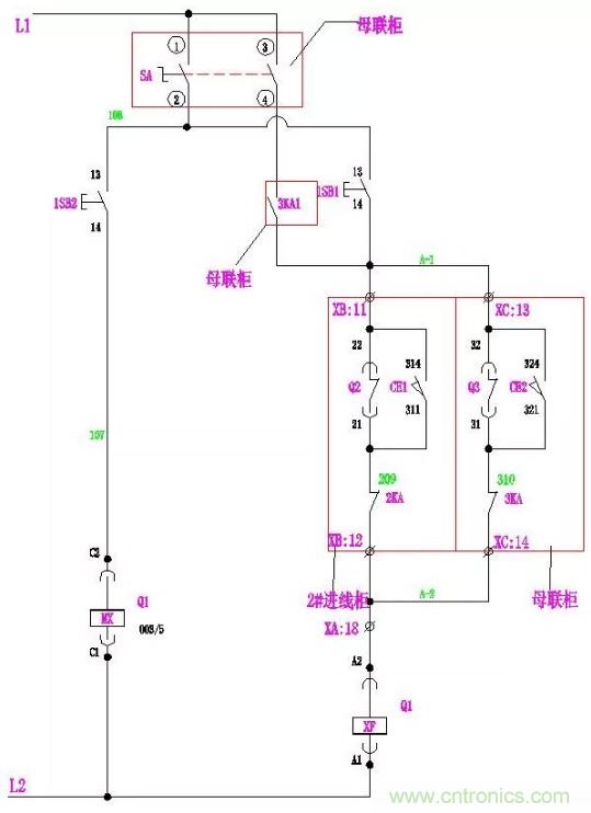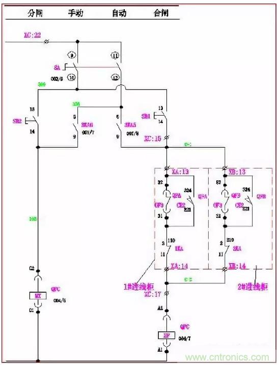 手動(dòng)時(shí):萬轉(zhuǎn)SA的1、2腳連通。當(dāng)Q2、Q3合閘,Q1合閘回路A-2、A-3斷開,其合閘線圈XF無法得電, Q1不能滿足合閘條件;同理,當(dāng)Q1、Q2或Q1、Q3同時(shí)合閘時(shí),Q2或Q3也同樣不能滿足合閘條件。使進(jìn)線柜與母聯(lián)滿足“三合二”邏輯。