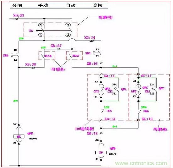 手動(dòng)時(shí):當(dāng)QFA、QFB合閘,QFC合閘回路C-1、C-2斷開,其合閘線圈XF無法得電, QFC不能滿足合閘條件;同理,當(dāng)QFA、QFC或QFB、QFC同時(shí)合閘時(shí),QFB或QFA也同樣不能滿足合閘條件。使進(jìn)線柜與母聯(lián)滿足“三合二”邏輯。