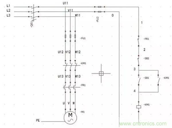 接下來(lái)我們看一下是怎么應(yīng)用的,先看一下一個(gè)帶有過(guò)載保護(hù)的接觸器自鎖控制的電路
