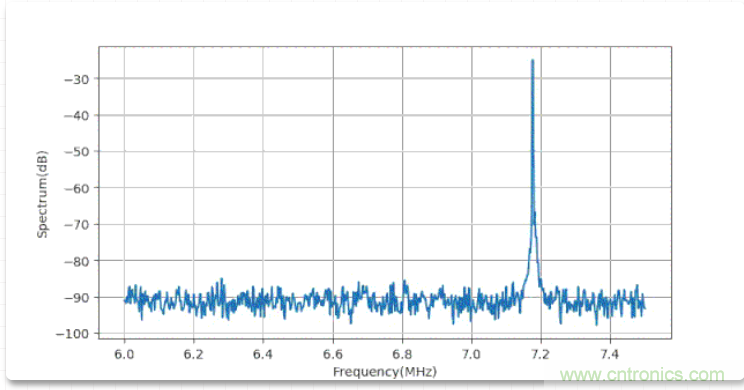 使用DSA815頻譜儀,加上單圈環(huán)形天線接收到的特斯拉線圈工作頻譜對應的頻譜如下。其中諧振諧振頻譜為6.8225MHz。
