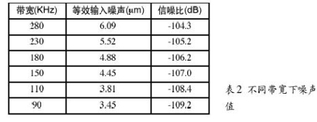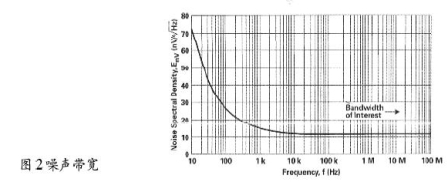 噪聲值—當(dāng)運放作為有源器件時,RF噪聲值與運放噪聲是一回事。熱噪聲有一定影響,但RF電路使用的電阻通常較小,它們的噪聲可忽略不計。運放RF電路的噪聲與增益和帶寬有關(guān)。例如,使用一個運放,應(yīng)用于10.7MHz中放,信號電平0dBV,增益為1,噪聲譜密度如圖2所示。此外,帶寬越窄,噪聲越低,見表2。