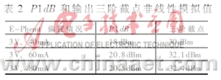 對(duì)于非線性模擬,常以諧波平衡模擬(HB)來實(shí)現(xiàn)。非線性模擬方法HB計(jì)算速度快,能夠處理分布元件和分立元件的電路,并很容易與更高階諧波及互調(diào)元件相容。ATF-54143管的P1dB和OIP3模擬非線性模型是基于W.R.Curtice模型,這個(gè)模型可以非常近似地模擬直流和小信號(hào)工作狀態(tài)(包括噪聲),對(duì)于截點(diǎn)的模擬則做出模擬預(yù)測(cè)結(jié)果比實(shí)際值要偏低。P1dB和OIP3的值如表2 所示:當(dāng)平衡LNA放大器的OIP3模擬結(jié)果為32.1dBm時(shí),P1dB則為20.8dBm,P1dB的模擬結(jié)果與實(shí)際的測(cè)量結(jié)果很接近,而OIP3的模擬結(jié)果則偏低,實(shí)際的測(cè)量結(jié)果達(dá)到37dBm。
