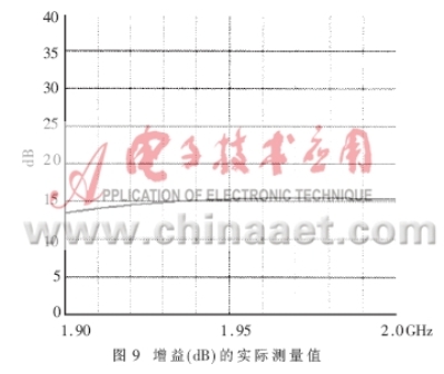 得到了完整的電路PCB板后,就要實(shí)際測(cè)量電路的各個(gè)參數(shù),驗(yàn)證設(shè)計(jì)的仿真結(jié)果是否與之相符,是否最終符合表1的設(shè)計(jì)技術(shù)規(guī)范。本文所采用的測(cè)試儀器是HP8753ES網(wǎng)絡(luò)分析儀和HP8970B噪聲儀。圖8、圖9表達(dá)出放大器實(shí)測(cè)的NF和增益曲線,在帶寬為0.1GHz的頻率范圍內(nèi)NF的值在0.8dB和1.0dB之間,增益在1.97GHz達(dá)到最大值15.5dB,在1.99GHz達(dá)到了15.3dB。由于NF是在實(shí)際PCB板外腔體內(nèi)測(cè)得的,包含了同軸連接器的損耗和二級(jí)噪聲損耗,其測(cè)量指標(biāo)表明實(shí)際的電路NF特性要稍差于模擬特性。圖10是輸入、輸出的回波曲線。當(dāng)頻點(diǎn)在1.96GHz時(shí),輸入回波為18dB,輸出回波達(dá)到22.5dB,放大器的OIP3在直流偏置Vds=3V,Id=60mA時(shí)測(cè)得值為37dBm,P1dB為21.4dBm。電路在較低的偏置狀態(tài)下Vds=3V,Id=40mA放大器的NF和增益都沒有降低,只有OIP3測(cè)出下降為36.5dBm。