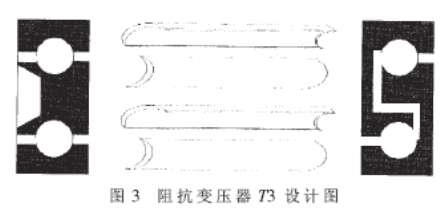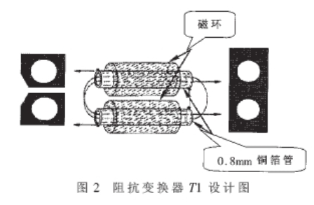 圖2中深色區(qū)域代表覆銅區(qū)域。銅箔管首先穿過磁環(huán)后再穿過兩端的銅膜板并焊接在一起,完成次級線圈。T2的設(shè)計基本與T1相似,只是使用同軸線SFF-1.5-1的芯線纏繞的初級線圈圈數(shù)不同而已。