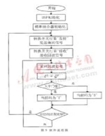 軟件流程如圖5所示。系統(tǒng)開始工作后,DSP初始化,F(xiàn)PGA配置頻率綜合器ADF4127L,產(chǎn)生精準的頻率源。詢問機轉(zhuǎn)換開關(guān)指向發(fā)射位置,發(fā)射單元發(fā)射詢問脈沖信號,經(jīng)過一段時間后,開關(guān)指向接收位置,接收單元接收回波信號,先進行A/D采樣,并將I路和Q路的采樣值平方相加,若大于編碼門限,則判定當(dāng)前碼為1,否則為0。一幀32位識別碼判別完后,詢問單元重新發(fā)出詢問信號,如此循環(huán)。解調(diào)出的識別碼通過串口送給外部設(shè)備,以供處理。