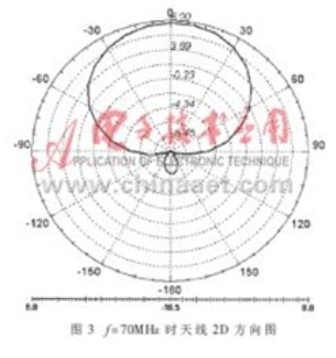 圖3為f=70MHz時(shí)天線的二維方向圖,從中可以看出,天線方向性系數(shù)達(dá)到7dB左右,而利用文獻(xiàn)中的圖表所查到方向性系數(shù)為6.5dB。圖4給出了幾個(gè)頻率下天線的二維方向圖,可以看出,各個(gè)頻率下方向圖形狀大致相同,但隨著頻率越靠近頻率范圍的上下限、方向圖背瓣越大。