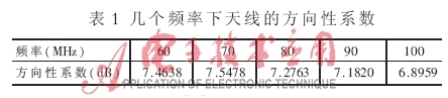 為了更形象地描述天線的方向性,軟件可以給出三維方向圖。頻率為60MHz和90MHz時(shí)天線的三維方向圖如圖5所示。表1給出天線的方向性系數(shù) 。
