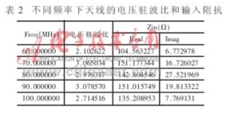 從文獻(xiàn)中可以查到本文所仿真的天線輸入電阻值約為150Ω,從文獻(xiàn)可以查到輸入電抗約為20Ω左右。實(shí)際上,不僅天線的輸入電抗與頻率有關(guān),而且不同頻率下輸入電阻也不同,利用仿真軟件可以比較準(zhǔn)確地得到這些參數(shù)。表2給出了幾種頻率下天線的輸入電阻與電抗值。從表2可以看出,仿真結(jié)果的輸入阻抗在工作頻帶內(nèi)與理論值有一定差別,隨著頻率接近天線頻率范圍的上下限,仿真結(jié)果與理論值相差越大。通過仿真計(jì)算所得到比較準(zhǔn)確的天線輸入阻抗,對于研究調(diào)制電路與天線的匹配問題有著非常重要的作用。