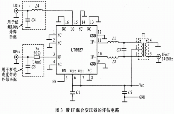 IF變壓器匹配實現(xiàn)最低的LO-IF泄漏和較寬的IF帶寬很簡單,如圖5所示為由3個元件構成低通濾波匹配網絡。匹配 元件C3、Ll和L2結合內部2.5 pF電容器形成1個400 Ω~200 Ω低通濾波匹配網絡,該匹配網絡諧振于所期望的lF頻率。這里4:l變壓器將200Ω差分輸出變換成50Ω的單端輸出。